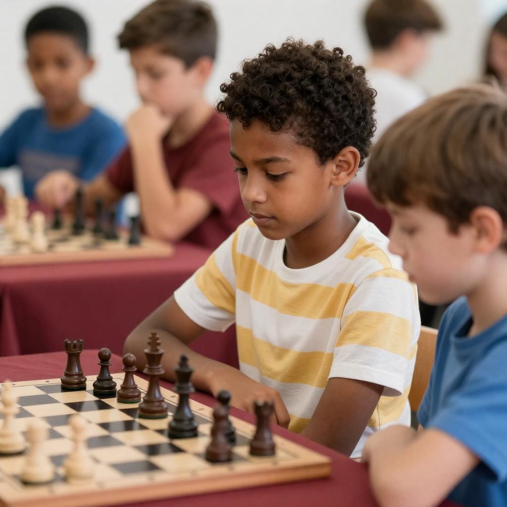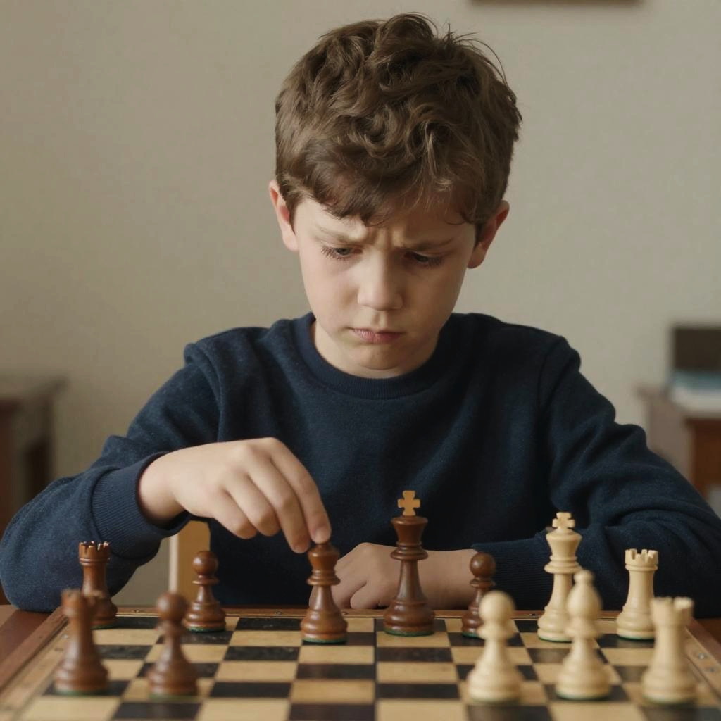 A captivating portrait of Child chess prodigy in the style of Rembrandt, showcasing intense concentration, slightly furrowed brow, and hands poised over a worn chessboard against a softly shaded background.