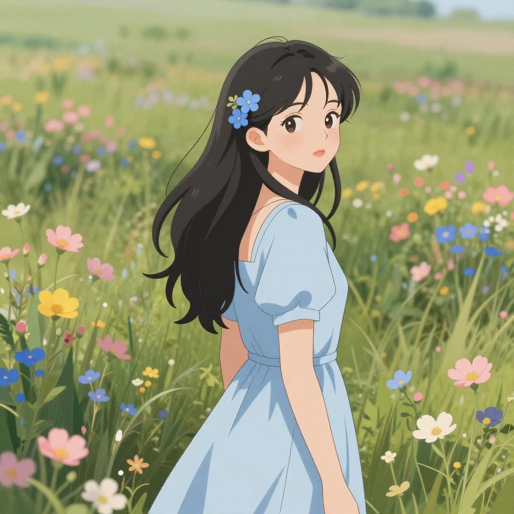 Digital anime-style drawing of a young woman with long black hair, adorned with small blue flowers, standing in a vibrant meadow. She's wearing a light blue, short-sleeved dress with a belted waist. The background is filled with colorful wildflowers in pink, yellow, and blue, with a green, sunlit field extending into the distance. She's looking over her shoulder with a gentle expression.