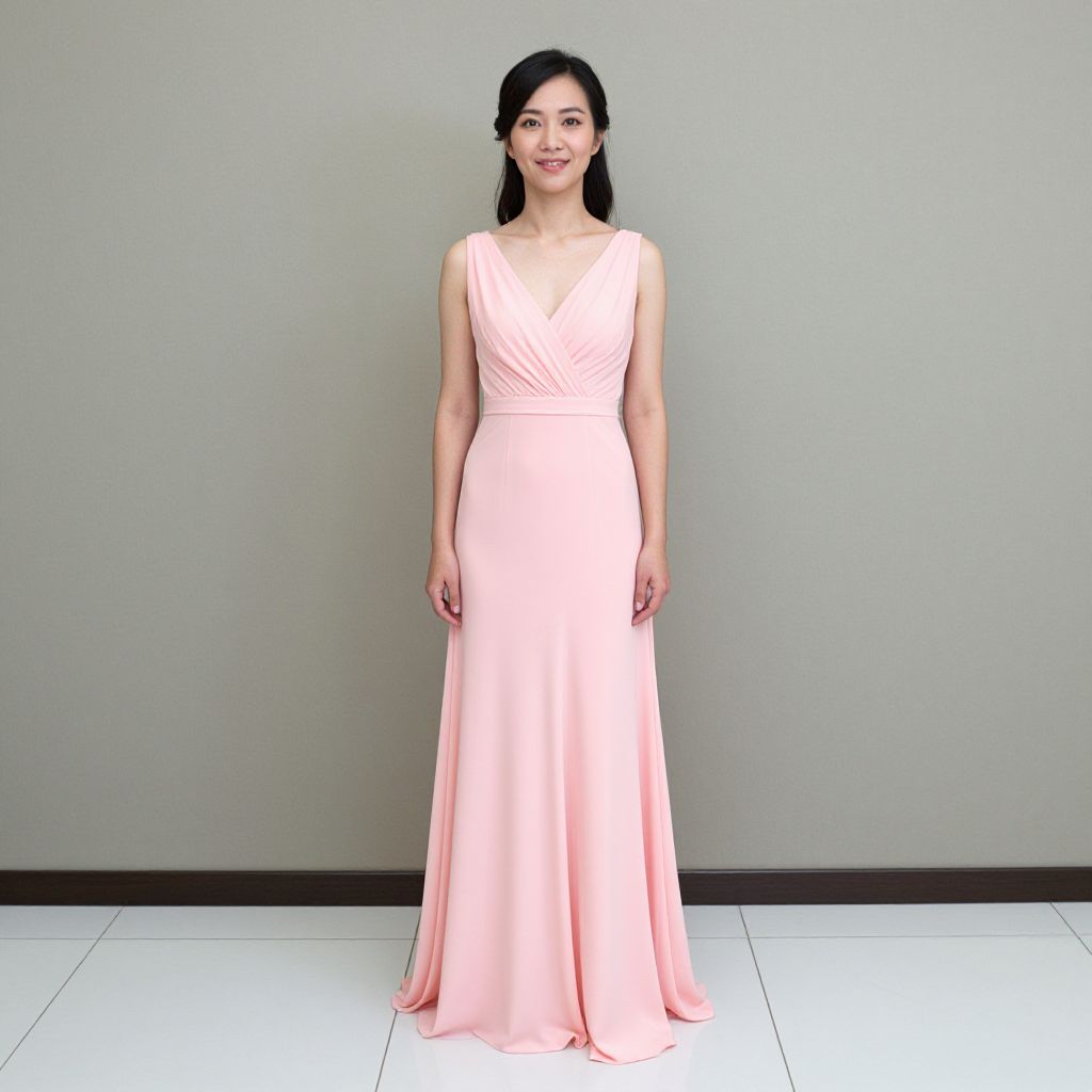 Photograph of an Asian woman with long black hair, wearing a sleeveless, white, knee-length dress and white heels, standing against a gray wall