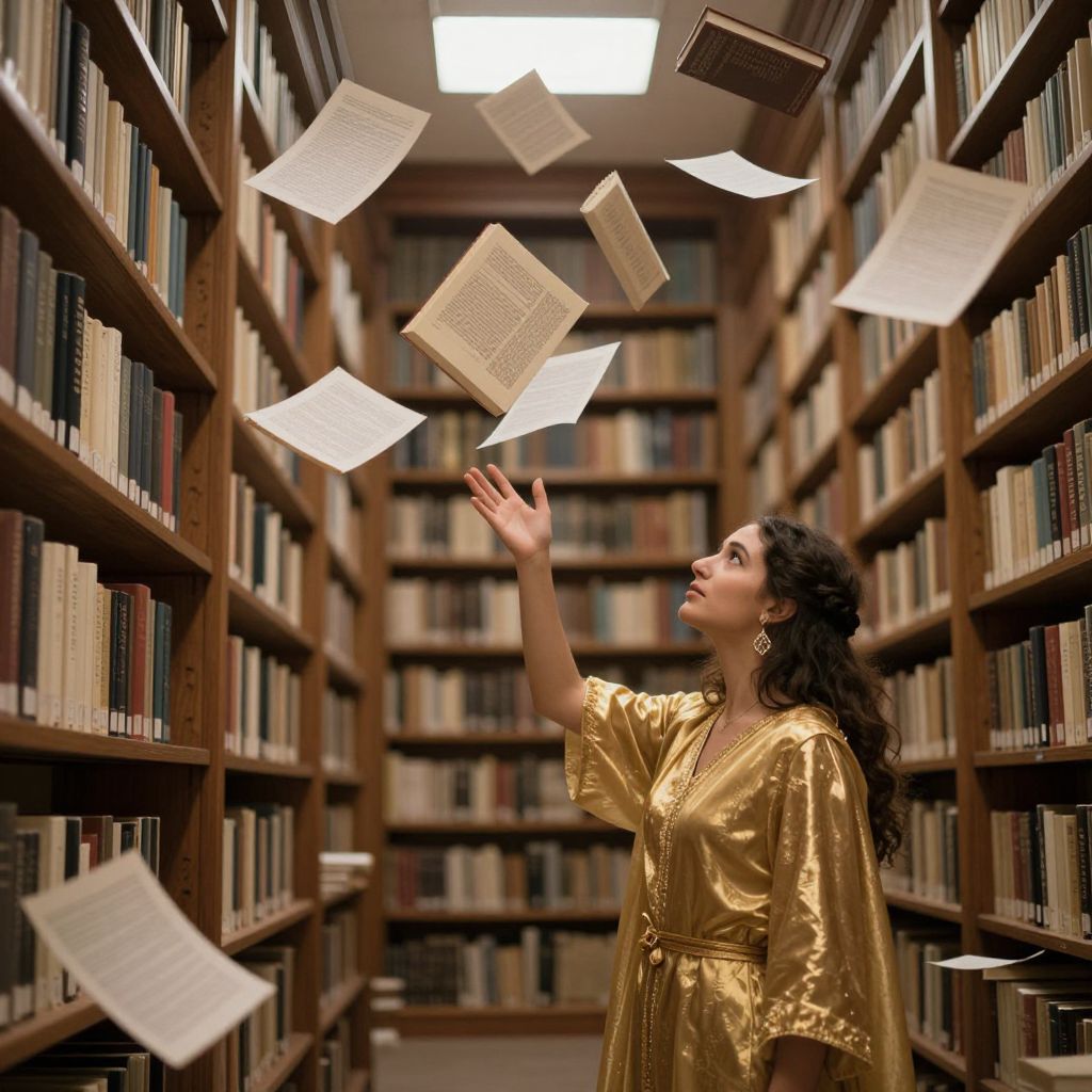 Photograph of a woman with curly dark hair in a golden, silky dress standing in a narrow library aisle. She is reaching up, and several books and papers are floating mid-air around her. The library is lined with tall, wooden bookshelves filled with books of various colors. The background is slightly blurred, emphasizing the woman and the floating objects. The ceiling has a bright, rectangular light fixture. The image has a magical, whimsical feel.