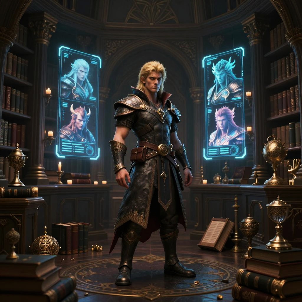 A digitally rendered image features a muscular, blond man with fair skin, wearing medieval-style black armor with intricate silver accents. He stands confidently in a dimly lit, ornate library with shelves filled with books. Two glowing, blue neon panels on either side display ethereal, holographic portraits of a horned figure and a fiery entity. The floor is adorned with a circular, magical rune. Candles, brass urns, and scattered books surround him, adding to the mystical atmosphere. The man's expression is intense, and the scene exudes a fantasy, sorcerer-like vibe with a blend of medieval and futuristic elements.
