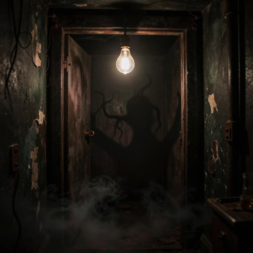 Dark scary closet with flickering old bulb, rusty hinges, peeling paint on walls, twisted shadows casting ominous shapes inside, a chilling sense of dread, creeping fog at the entrance, ultra-detailed horror scene with a nightmarish ambiance