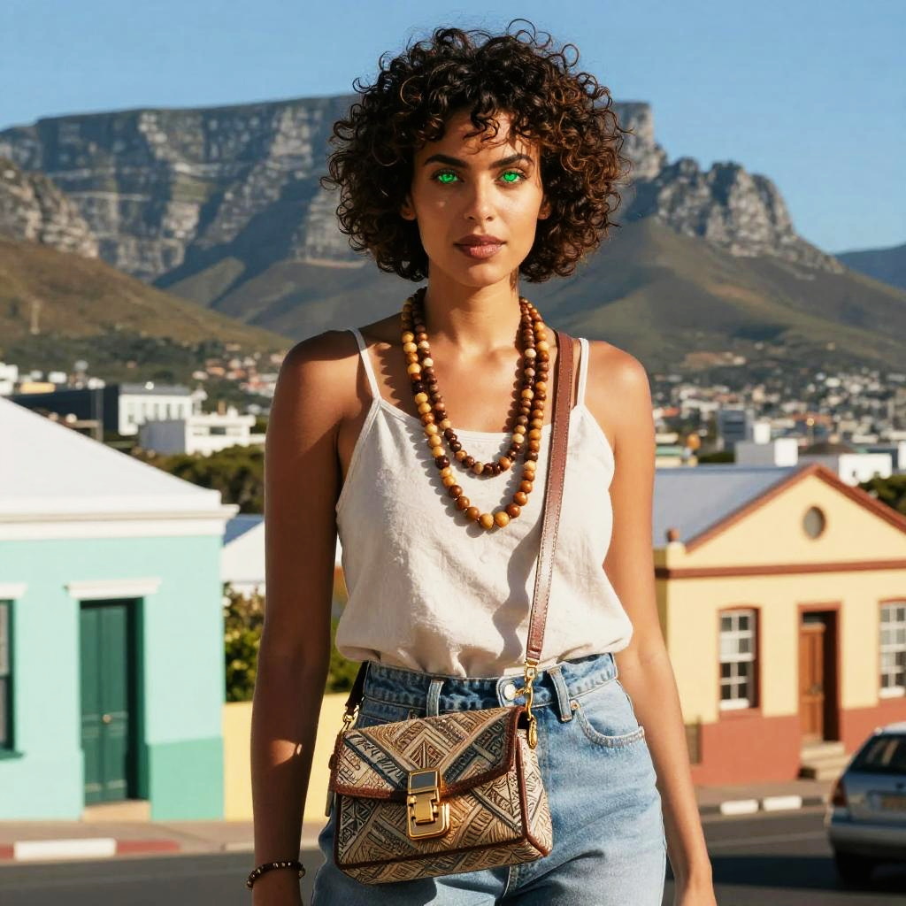 Realistic photo.chic South African woman with bright green eyes and curly, short hair, wearing a trendy crossbody bag and adorned with wooden beaded necklaces. Dressed in casual, stylish wear that emphasizes her glamorous appearance, she stands against a backdrop of vibrant Cape Town with stunning mountain views and colorful houses. The scene exudes an air of elegance and old-world charm, with intricate details that highlight the mix of modern glamour and historic surroundings. realistic photo
