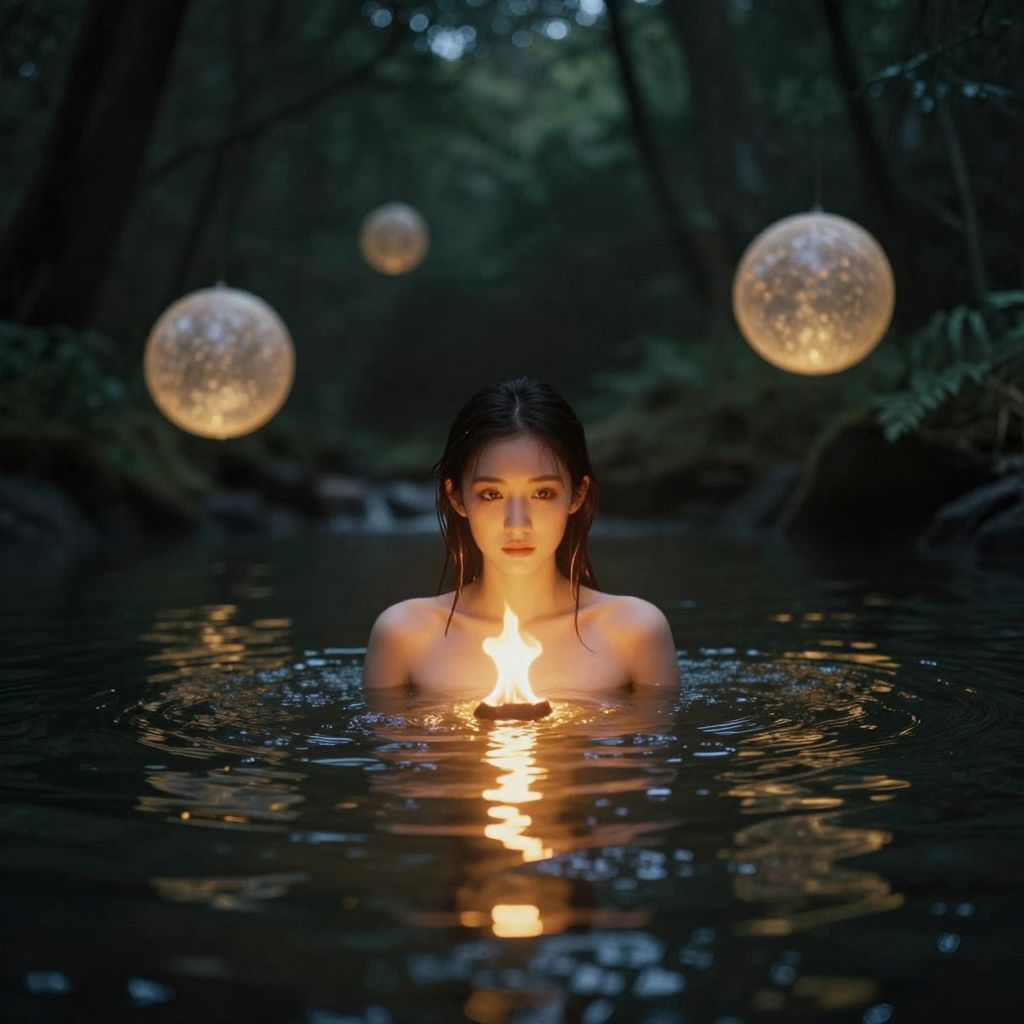 Photograph of a young woman with wet, dark hair, floating in a dark, forested stream at night. She is topless, with only a lit candle floating in the water at her chest, illuminating her face. Her expression is serious and focused. In the blurry background, three glowing, spherical orbs float above the water. The dark, dense forest and water create a mysterious, ethereal atmosphere. The candlelight casts reflections on the water's surface, adding a warm contrast to the dark surroundings. The overall mood is magical and somewhat surreal.