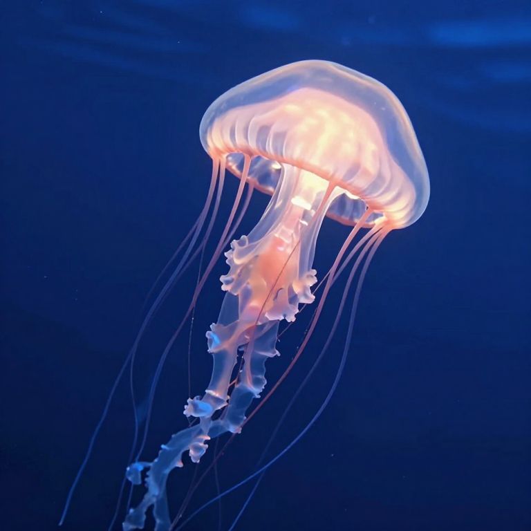 A mesmerizing 3D-rendered jellyfish glows softly against the deep blue ocean backdrop, its translucent body illuminated by a warm, ethereal light that evokes a dreamlike, otherworldly atmosphere reminiscent of a floating desert above a cosmic sea.