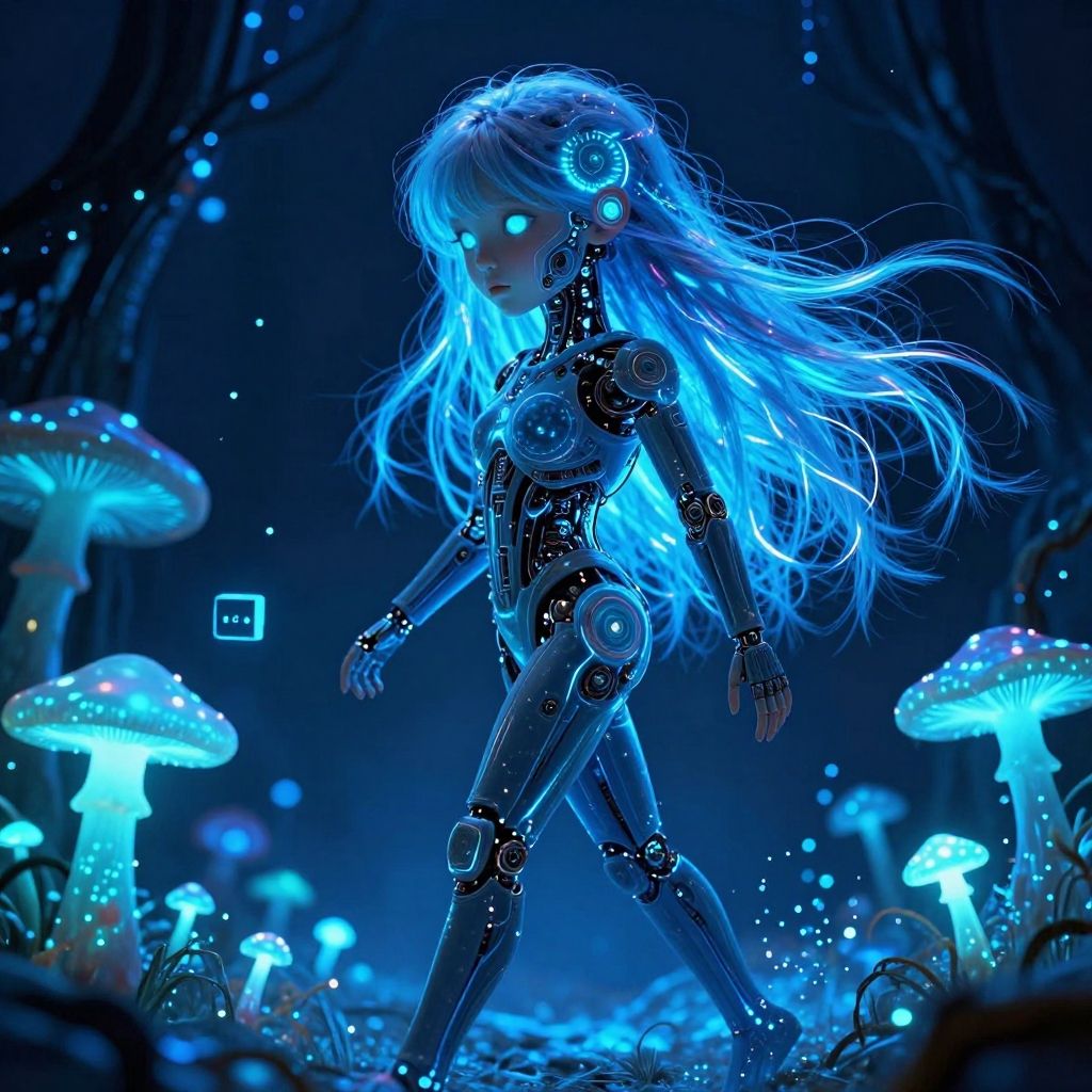 (Closeup portrait), extreme closeup, (((bioluminescent lighting, blue light: 1.5, blue lighting: 1.5, blue tint))), 1 girl, glow in the dark eyes, glow in the dark hair:1.5, biomechanical cyberpunk gene-spliced hybrid, being resulting from genetic manipulation, exhibiting a mix of species traits, cybernetics, human-machine fusion, dystopian, organic meets artificial, dark, intricate, highly detailed, long hair, walking, dynamic pose, lightstreaks, detailed background:(glow in the dark; bioluminescent; fluorescent mushrooms; fluorescent environment; glowing mushrooms; cubes bioluminescence; glowing particles; light particles), ((night: 1.5)), futuristic, hyper pop, (surrealism), eerie, in the style of dan mumford and marc simonetti, best quality, (realistic details:1.3), (Ultra Realistic:1.6), 32k, (Masterpiece:1.2), (High Detailed Skin:1.0), (High Quality:1.0), (Detailed Realistic Background:2), (Official Art, Beautiful and Aesthetic:1.2), (Realistic Lighting:1), (raytracing:1), (render octane:1)