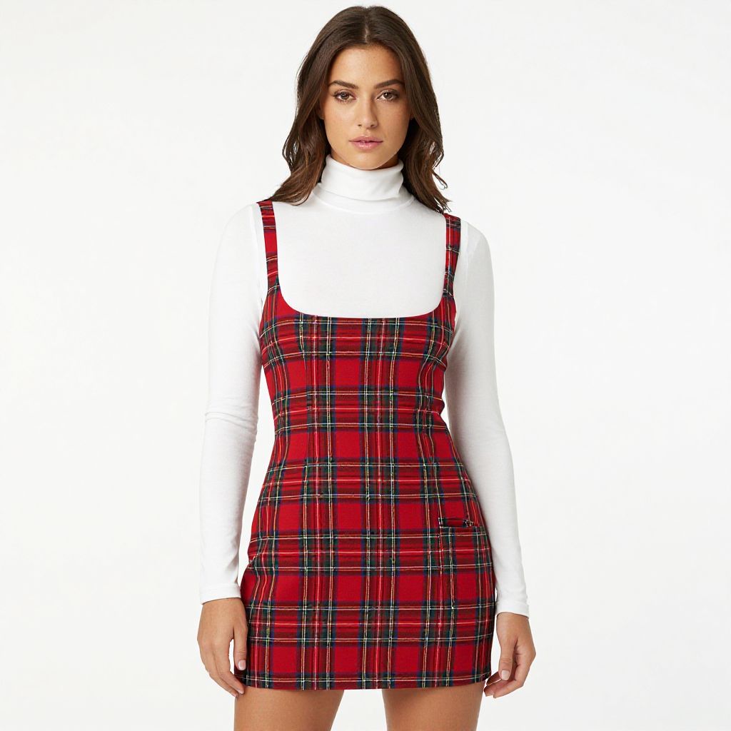 Photograph of a woman with long dark hair, wearing a red plaid pinafore dress over a white long-sleeve turtleneck,