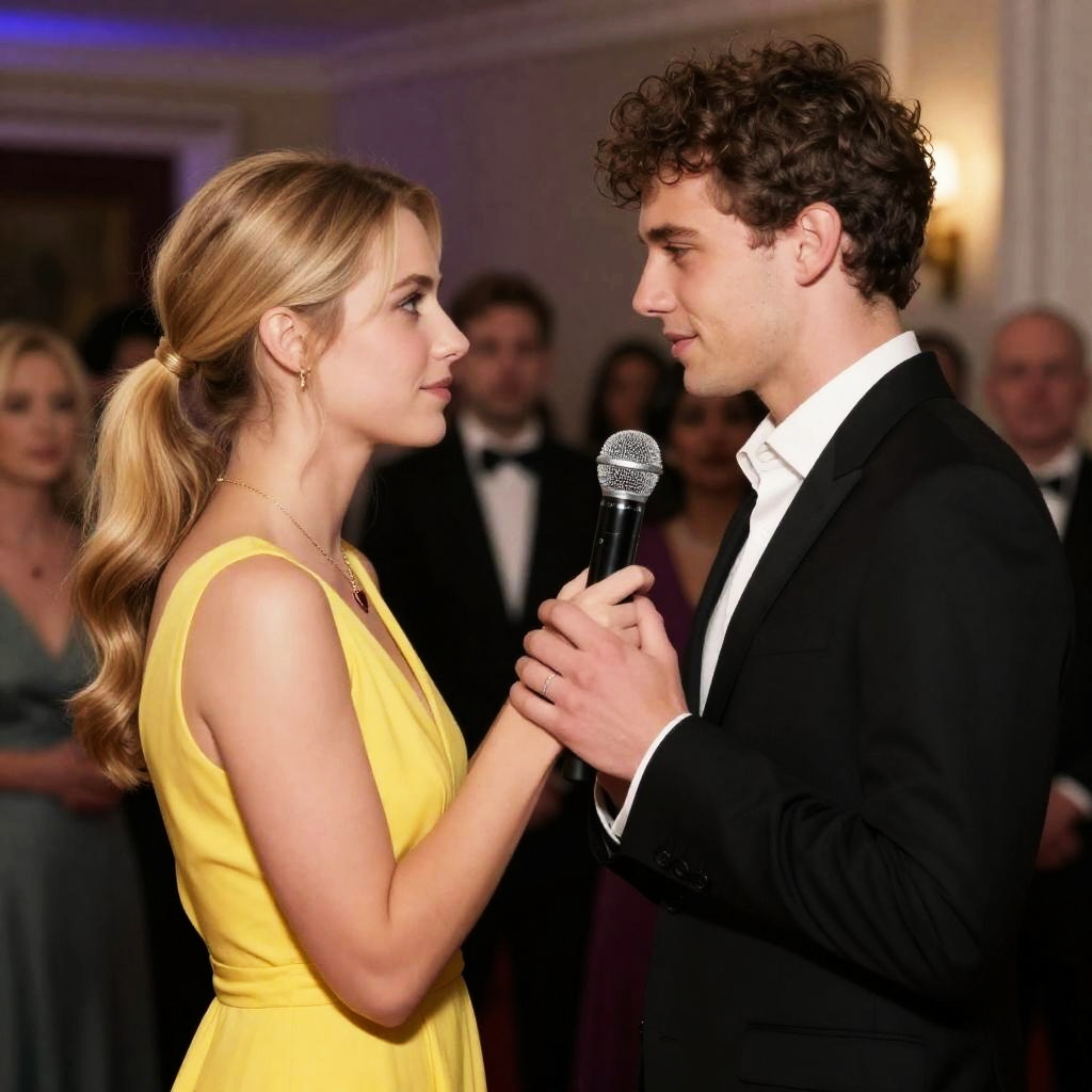 A joyful couple dancing closely at a formal event. The woman has blonde curly hair, wears a green off-shoulder dress, a delicate necklace, and pearl earrings, and holds a glass while laughing. The man has short brown hair, dressed in a white tuxedo jacket with black lapels, a black bow tie, and a white shirt, looking warmly at her. The background is softly blurred with warm lighting and other guests in formal attire.