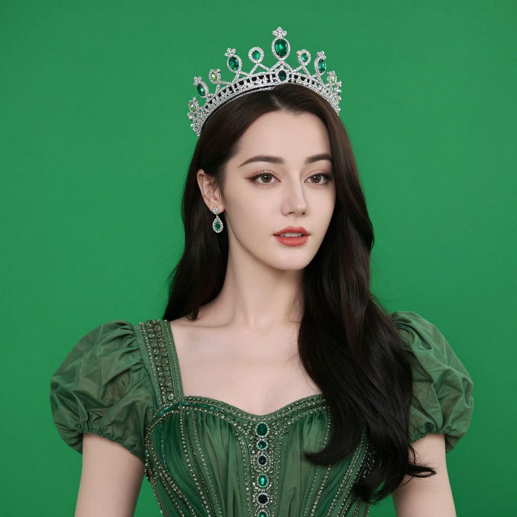Queenly elegance radiates as a woman dons a sparkling crown adorned with emeralds and diamonds, complemented by a deep green dress featuring puffed sleeves and intricate detailing, set against a vibrant green screen backdrop.