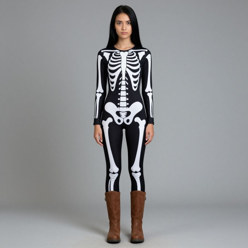 Photograph of a young woman with long black hair standing against a plain gray background. She's wearing a black bodysuit with a white skeleton pattern covering her torso, arms, and legs. Her brown knee-high boots contrast with the bodysuit. She stands with a neutral expression, arms relaxed by her sides. The lighting is even, highlighting the skeleton design on her outfit.