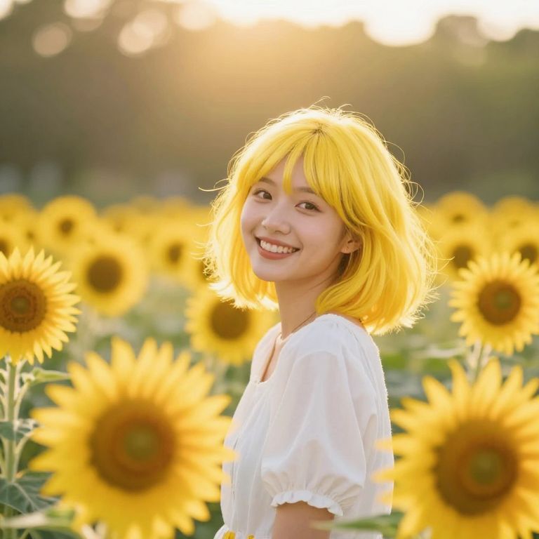 A cheerful sunflower girl with bright yellow hair and a vibrant smile stands in a sunny meadow during morning light, flowers blooming all around her, soft golden sunlight filtering through the trees, natural and lively atmosphere with a warm, joyful expression on her face.
