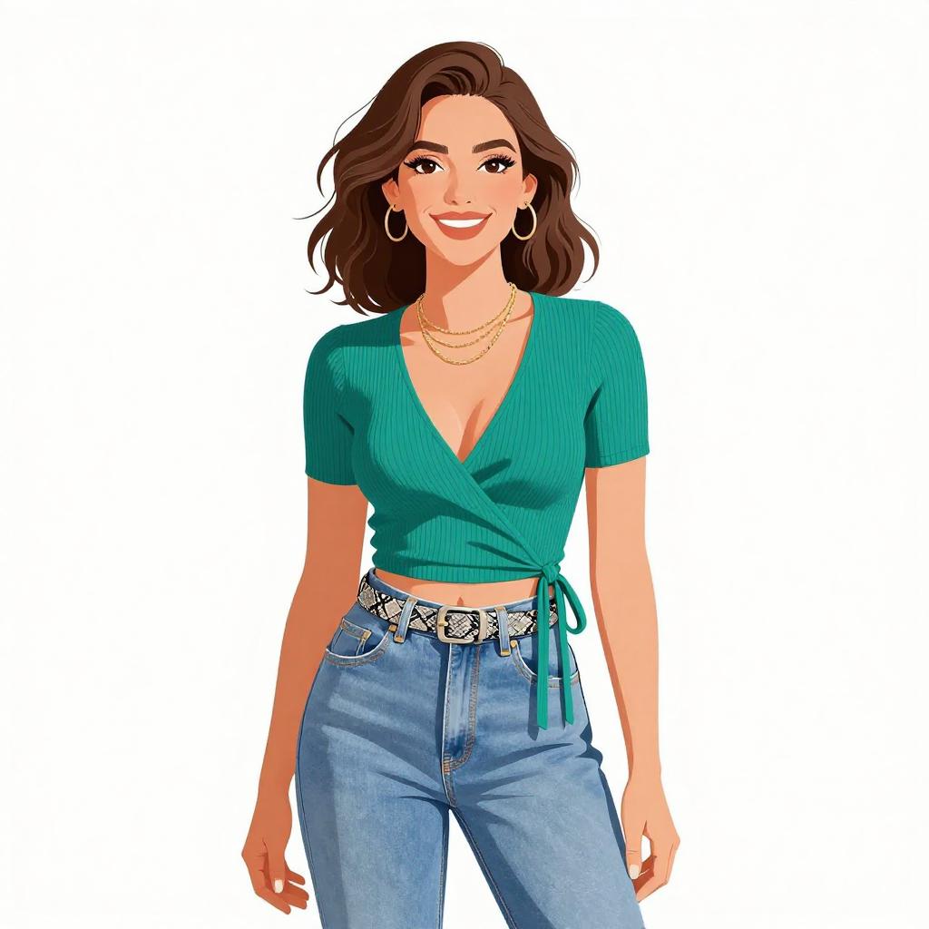 Woman with pretty face and pretty hair. smiling Woman, casual chic, ribbed wrap top in teal with short sleeves and side tie, V-neckline, layered gold necklaces, high-waisted light-wash denim jeans with a straight-leg fit, grey snakeskin textured belt with a silver buckle, plain white background. --sref 1467