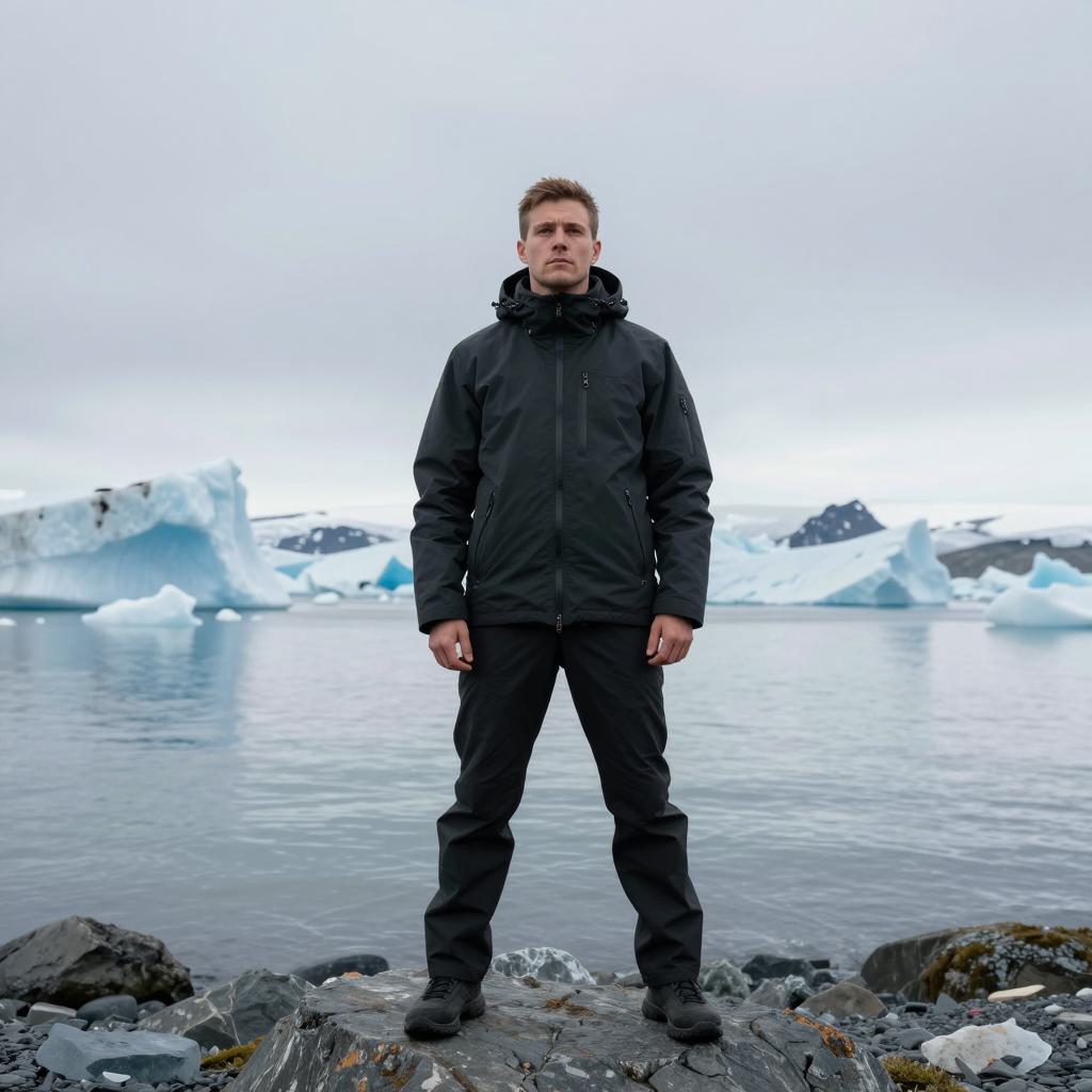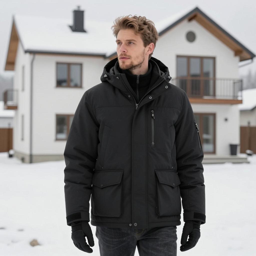A man stands confidently among shipping containers in a bustling port area, dressed in a warm black jacket and gloves. The industrial setting highlights the importance of logistics and transport, showcasing the man's focus and resilience in a challenging environment.