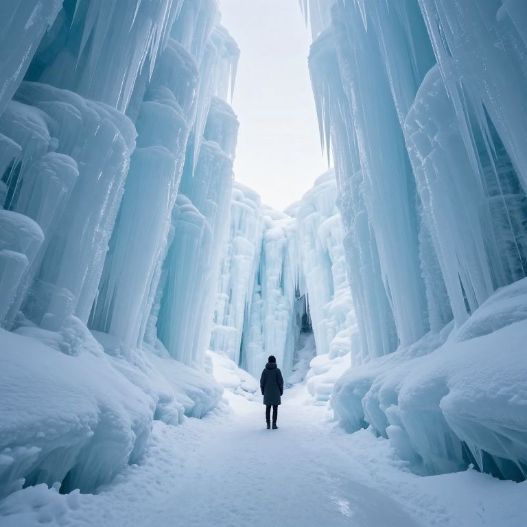 A solitary figure stands at the center of a frosty, cavernous pathway, surrounded by towering ice formations that stretch upwards into a luminous, ethereal light, creating an otherworldly scene of icy serenity and mystery.