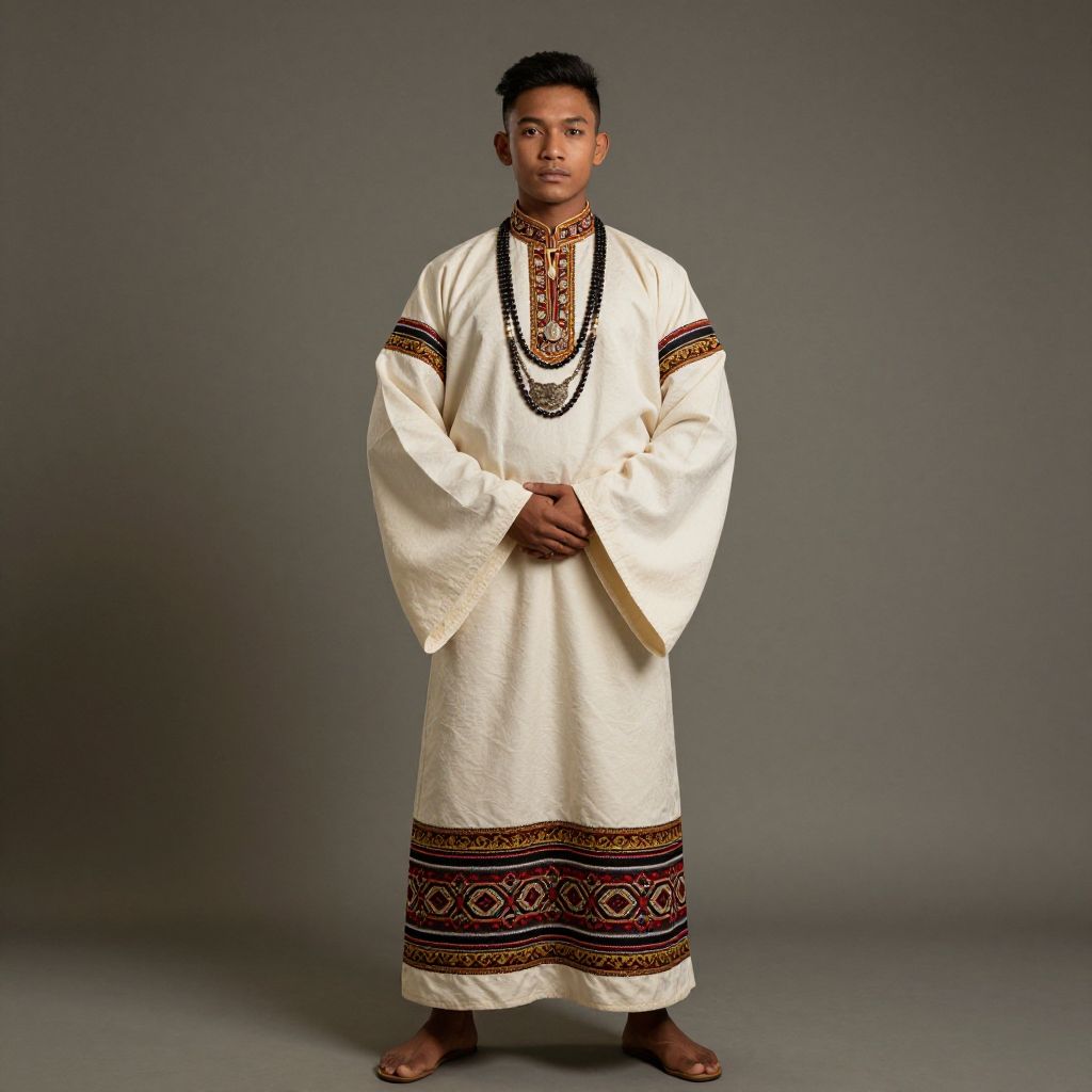Malong traditional costume, solo, 1boy, male focus, standing, wide sleeves, long sleeves, full body, looking at viewer, jewelry