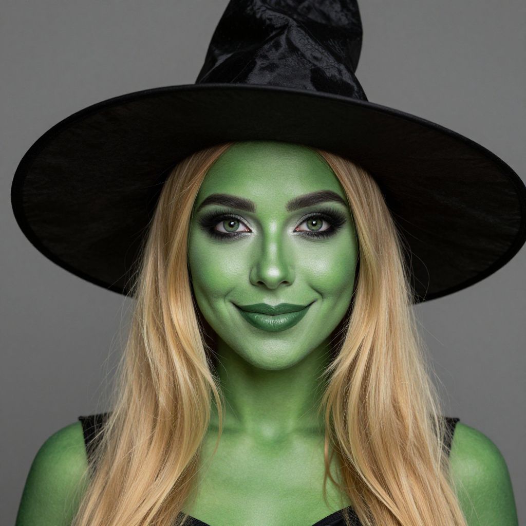 Witch costume green face, solo, green skin, hat, 1girl, colored skin, witch hat, looking at viewer, long hair, blonde hair, smile