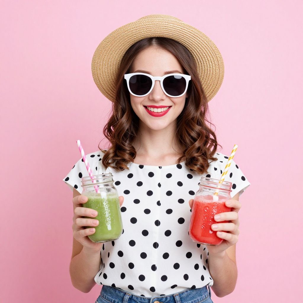 Smiling young woman wearing a straw hat, sunglasses, and a polka-dot blouse stands against a vibrant pink background, holding two glass jars filled with colorful beverages, each with striped straws.