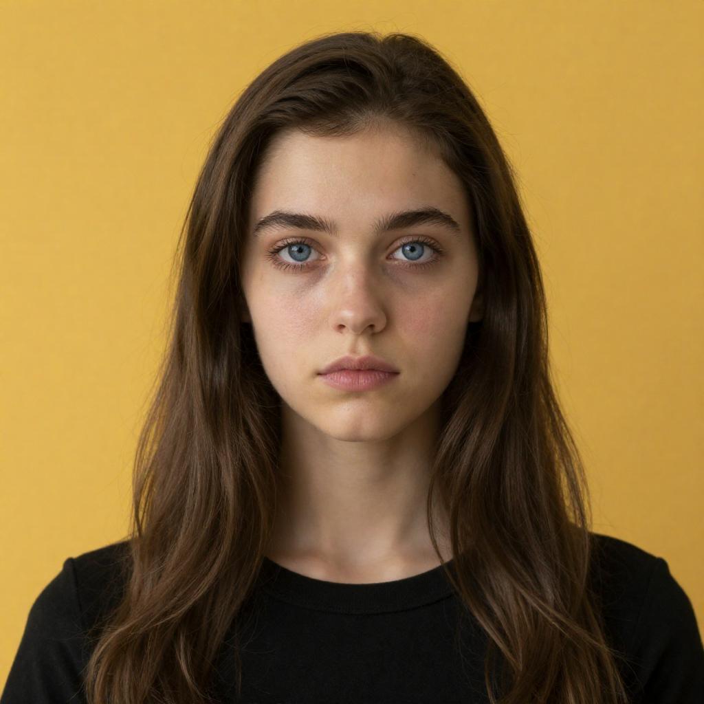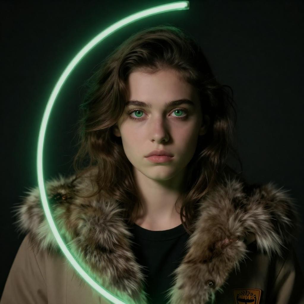 Photograph of a young woman with fair skin and green eyes, wearing a fur-trimmed coat. She has wavy brown hair and a serious expression. A green, glowing light arc frames her face from the left. The background is dark, emphasizing her illuminated features. A "Timberland" is in the bottom right corner.