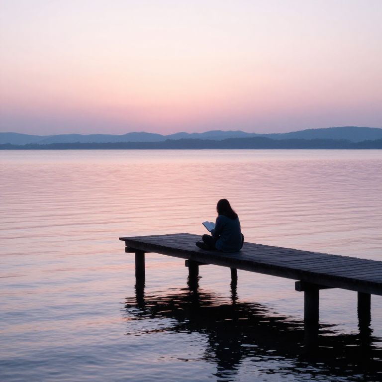 Taking a moment of quiet reflection beside a tranquil lake at sunset, colorful sky reflected on glassy water, a person sitting on a wooden dock, surrounded by lush foliage, hyper detailed painterly style with warm tones.