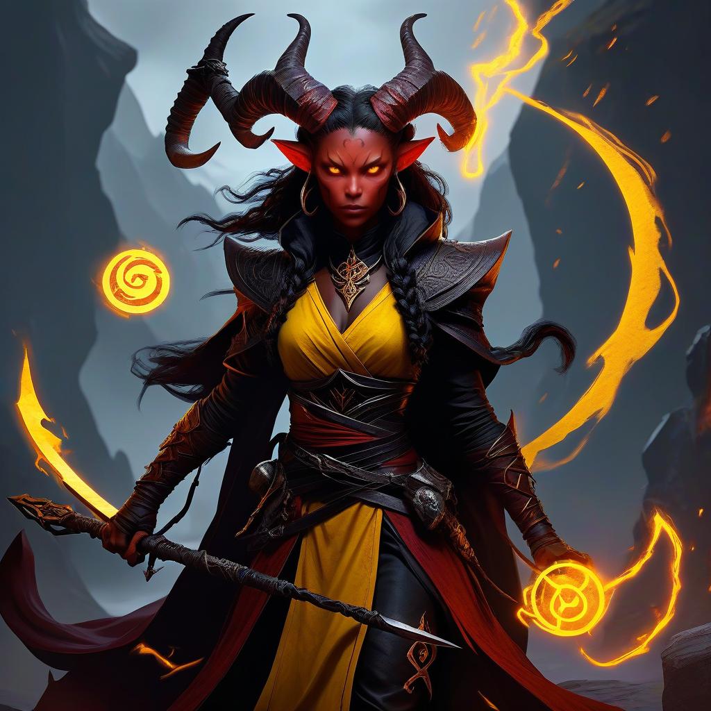 Fantasy character: Tiefling warlock named Zephyra, crimson skin, glowing yellow eyes, dark robes adorned with silver runes, carries a gnarled staff, moves with feline grace, concept art with cinematic flair.