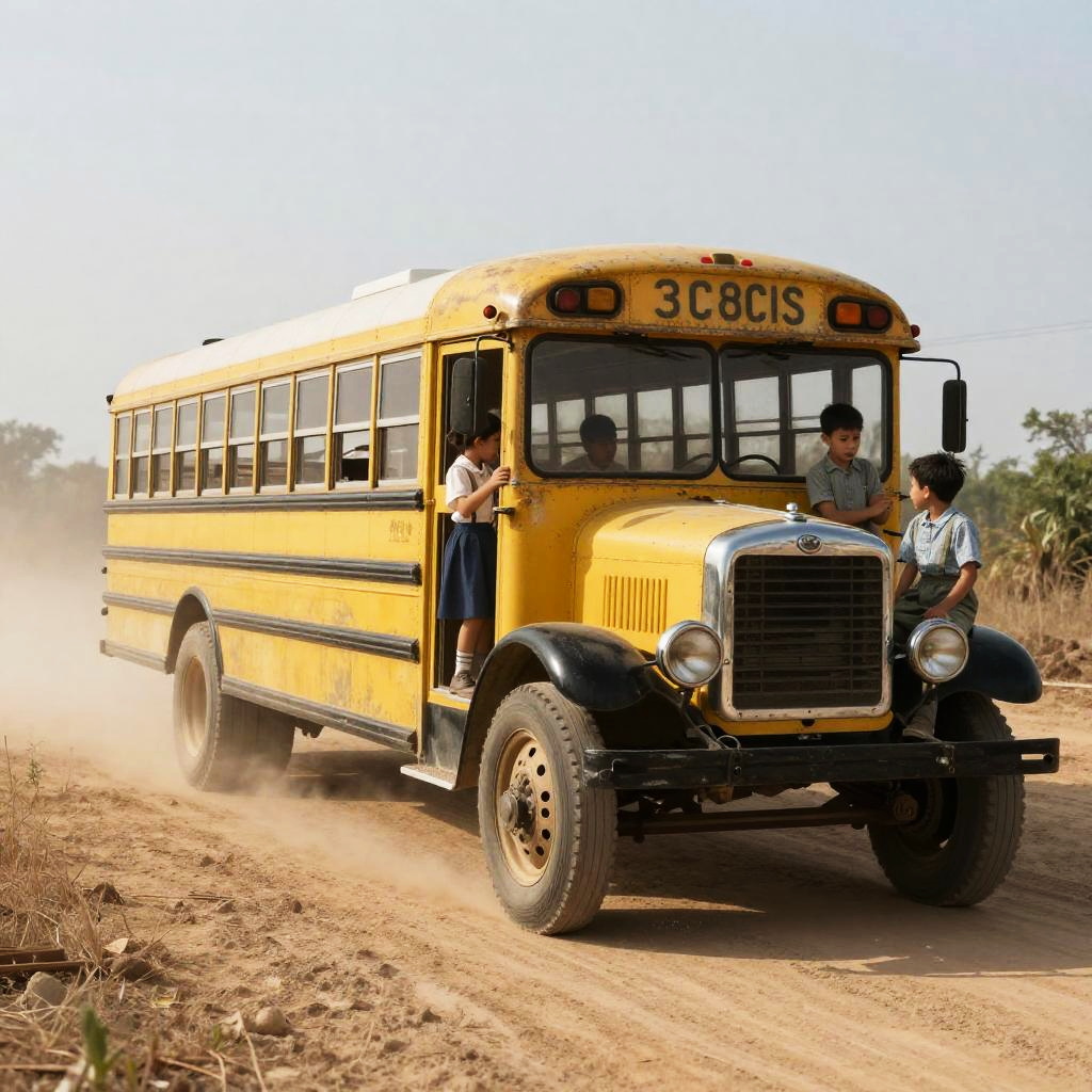 1920 school bus driving down a dusty country road, vintage yellow paint faded, wooden slats on windows, children in period clothing, early morning sunlight, nostalgic atmosphere