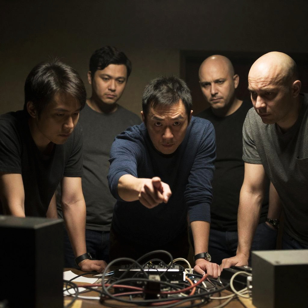 Group of five men in a cluttered, dimly-lit room with tangled wires and equipment. Central man leans forward, intense gaze, pointing. Bald men on either side, focused expressions. Man with dark hair, slightly to the left, looks down. Objects and wires in foreground, soft light from above.