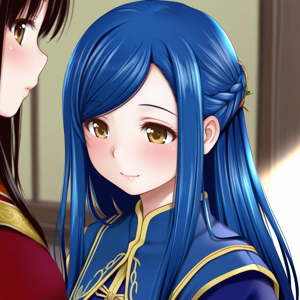 This digital anime-style illustration features a close-up of a young woman with long, vibrant blue hair, styled with a small braid on the right side. She has large, warm brown eyes and a gentle smile, with a subtle blush on her cheeks. She wears a blue and gold military-style uniform with high collars and gold trim. To the left, partially in the frame, is another character with black hair and a red and gold uniform. The background is blurred, with hints of light and dark brown, suggesting an indoor setting. The lighting highlights the blue hair and uniform, creating a soft, warm ambiance.