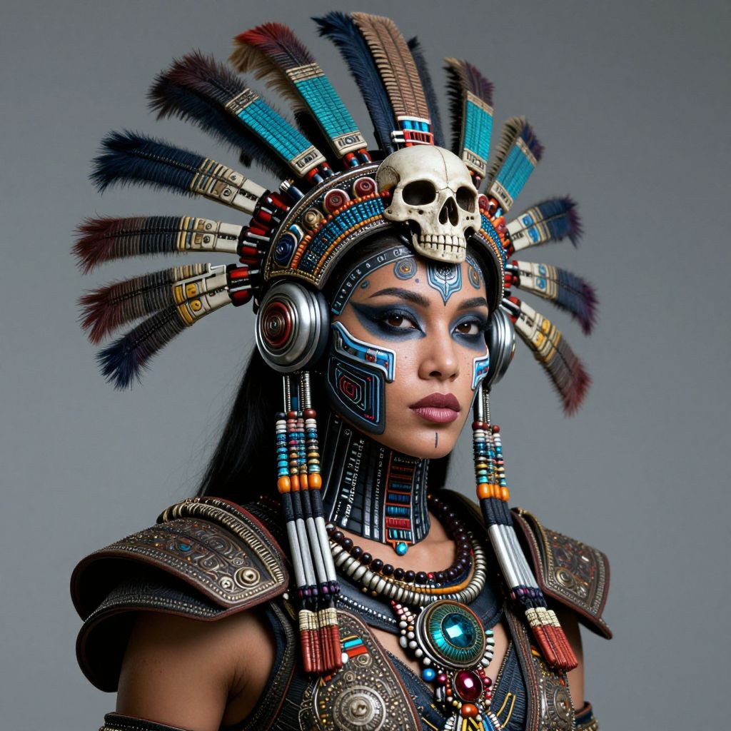 A cyberpunk Aztec warrior woman with intricate face paint, elaborate headgear, and advanced cybernetic implants in her skull, depicted in a hyper-realistic full portrait by Artgerm and Kuvshinov.