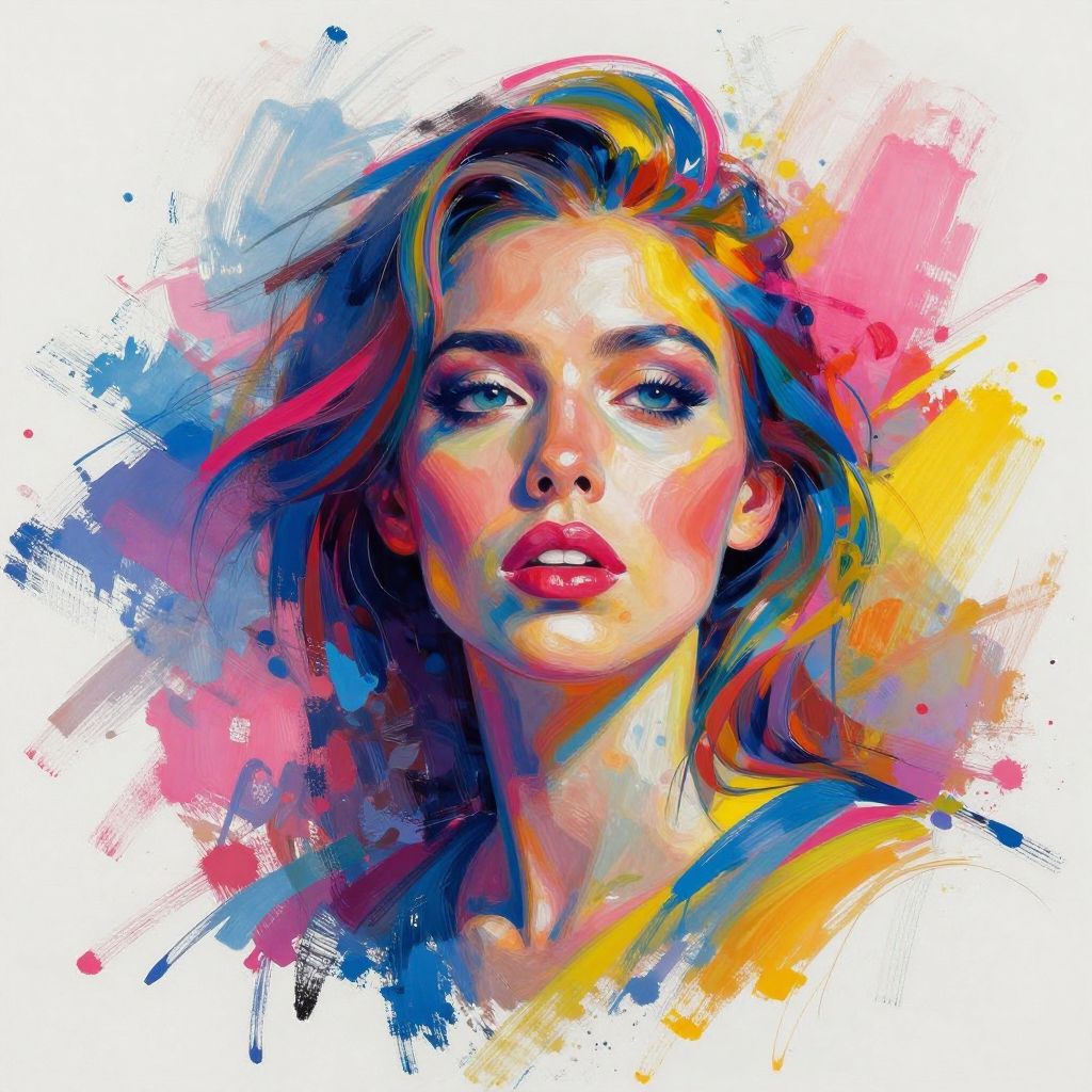 Colora abstract portrait of a woman with vividly colored paint strokes blending into the background, expressive brush style, vibrant palette of blues, pinks, and yellows, dynamic movement illusion, artistic and emotional intensity