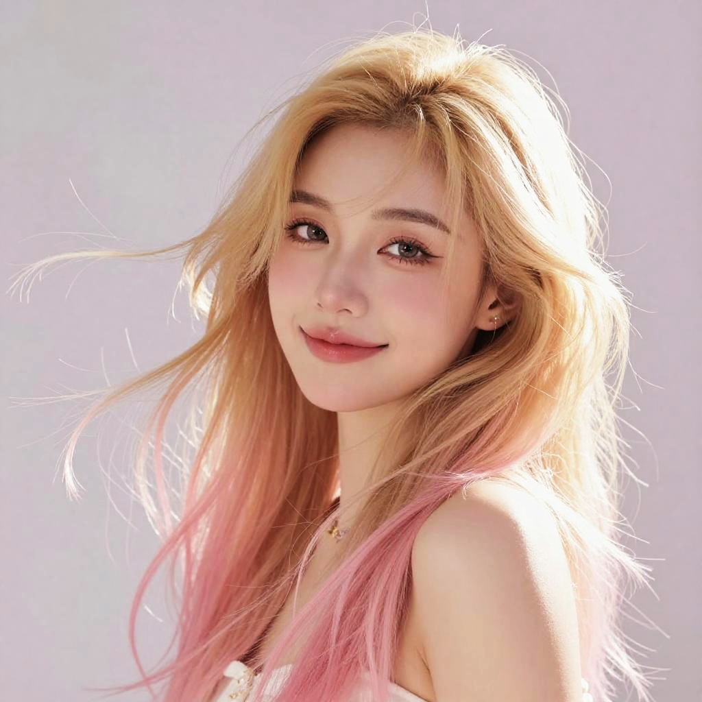 Photograph of an East Asian woman with long, wavy blonde hair that fades into pink at the ends. She has fair skin, large almond-shaped brown eyes, and a slight, confident smile. She wears a light-colored, sleeveless top, and a small, delicate necklace. The background is a soft, gradient white to light gray, and the lighting is bright, highlighting her hair's texture and giving it a glowing effect. Her hair appears slightly tousled, adding a natural, casual look to her appearance.