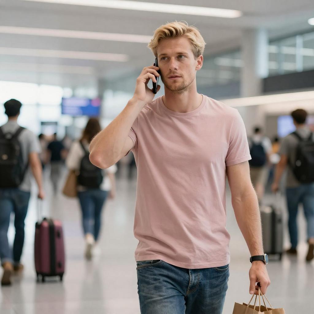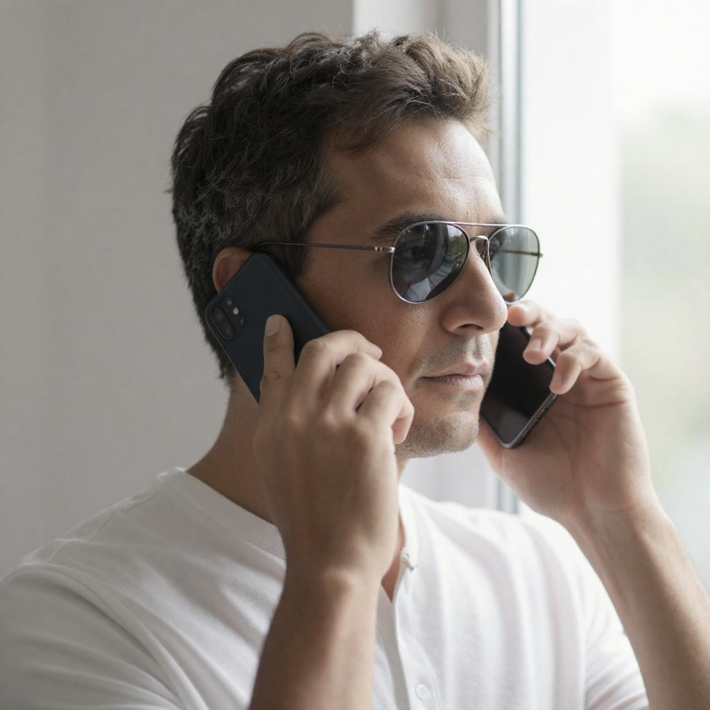 Photograph of a bearded man with blonde hair, wearing a blue floral shirt, talking on a cellphone. He stands outdoors near a green bush, with a blurred urban background. His expression is focused. The image has a slight blur effect.