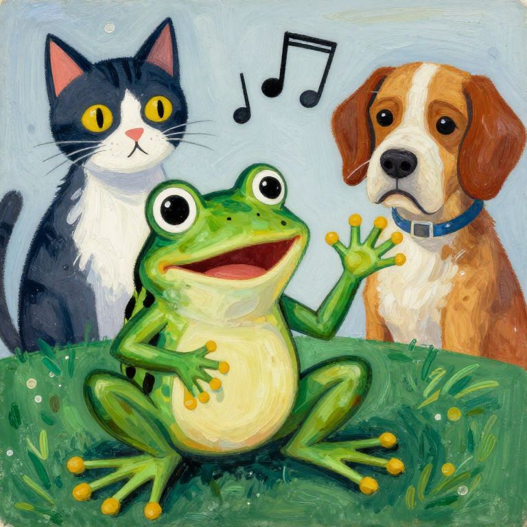 Suprematism A happy Frog sings a song, and cat and a dog cover their ears in the background with pained facial expression, drawing.,