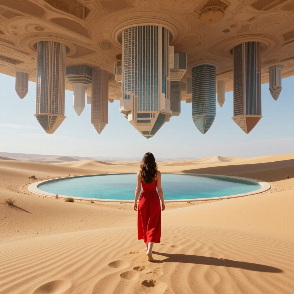 In a surreal 3D-rendered desert landscape, a woman in a red dress walks toward an otherworldly, inverted cityscape suspended above a tranquil oasis, where gravity-defying architecture and floating shadows blend seamlessly with the natural environment, evoking a dreamlike, cyberpunk-inspired fantasy.