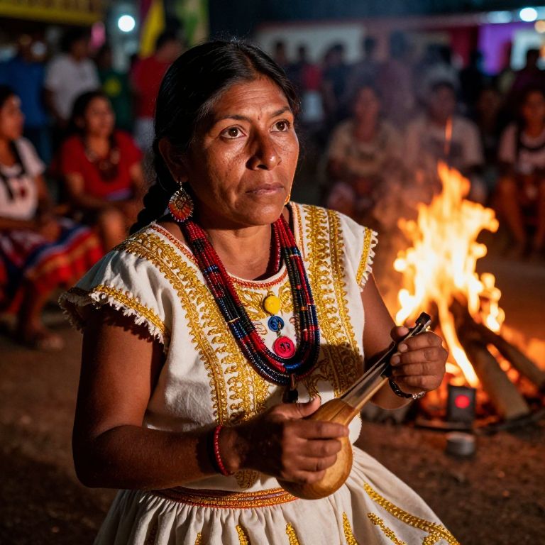 Imagine a portrait of a South American musician with deep, rich skin tones and captivating hazel eyes, illuminated by the warm, flickering light of a bonfire in an intimate courtyard. She wears traditional attire—a flowing hand-woven dress adorned with intricate golden embroidery and rugged beading. From an overhead perspective, we see her playing an ancient instrument, exuding both passion and resilience. Her expression captures the essence of her journey and cultural roots amidst the vibrant backdrop of a bustling local festival.