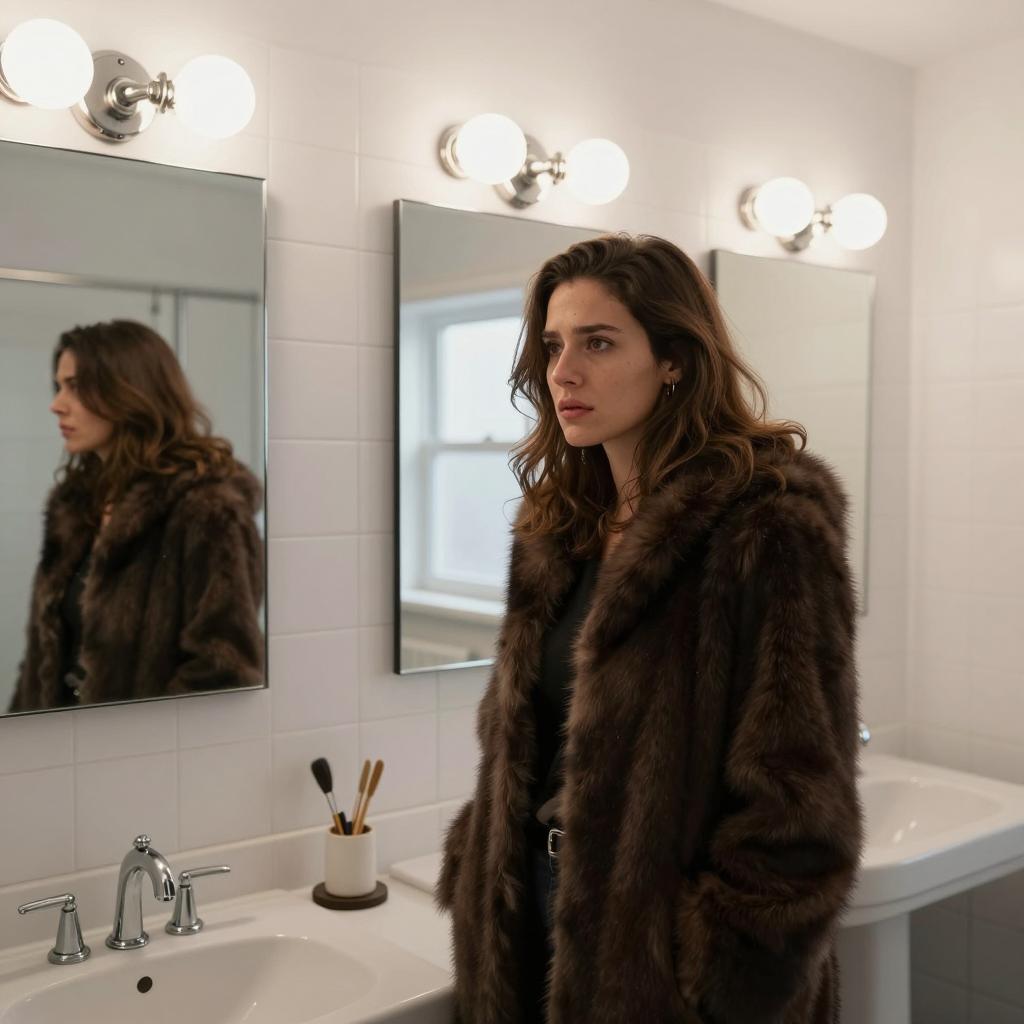 Two people with messy hair, one in a beige blouse and the other in an open white shirt, stand in front of a broken mirror with shattered glass. The person in the white shirt holds a piece of glass. The bathroom has beige tiles and a black soap dispenser. Reflections distort the image. The person in the foreground is blurred.