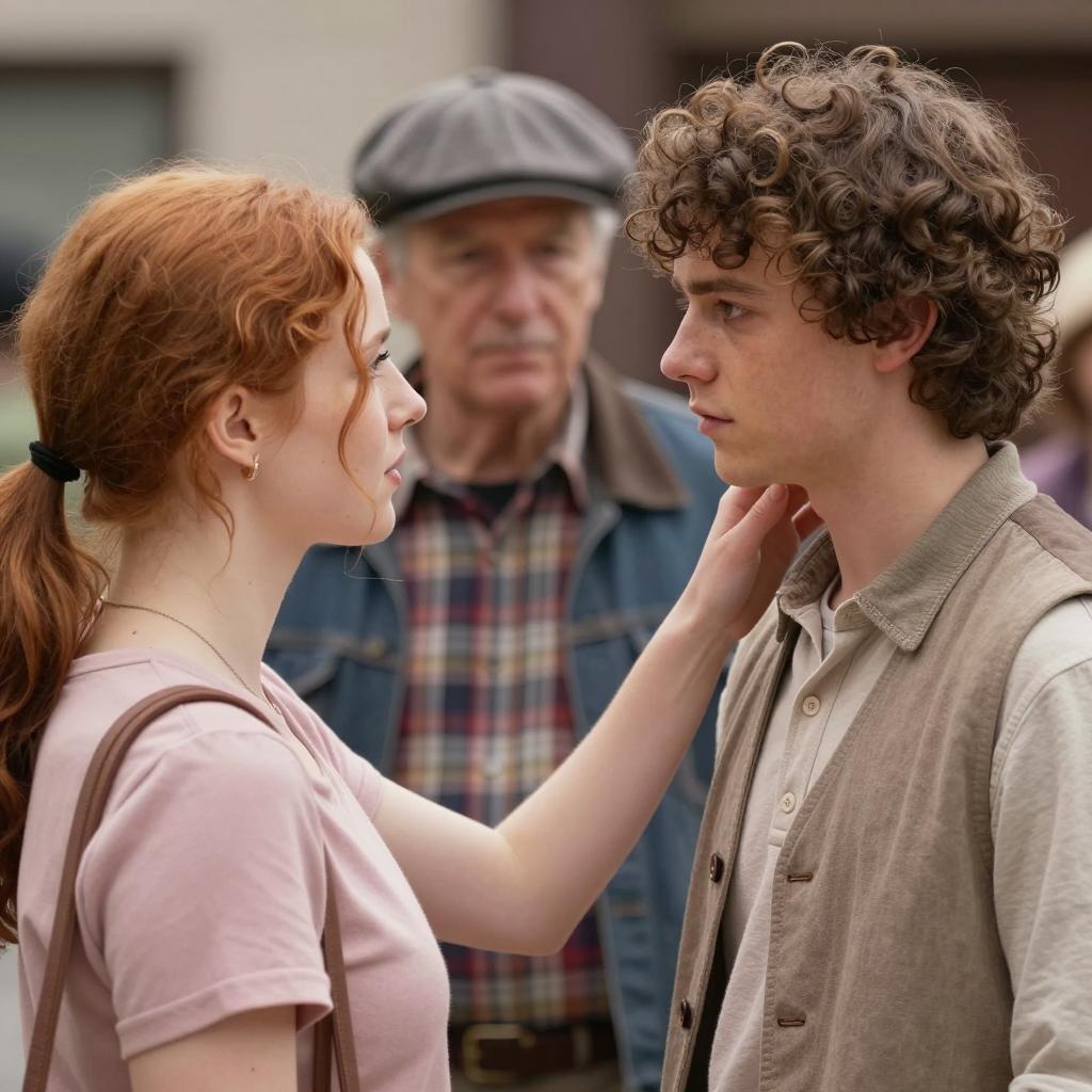 Photograph of two people in a stone structure. Blonde girl in blue blazer, red plaid skirt, holding flowers, sitting right. Older man with brown jacket, white headscarf, sitting left. Both looking at each other. Book and wooden box on floor. Grass outside. Sunlight filtering through.