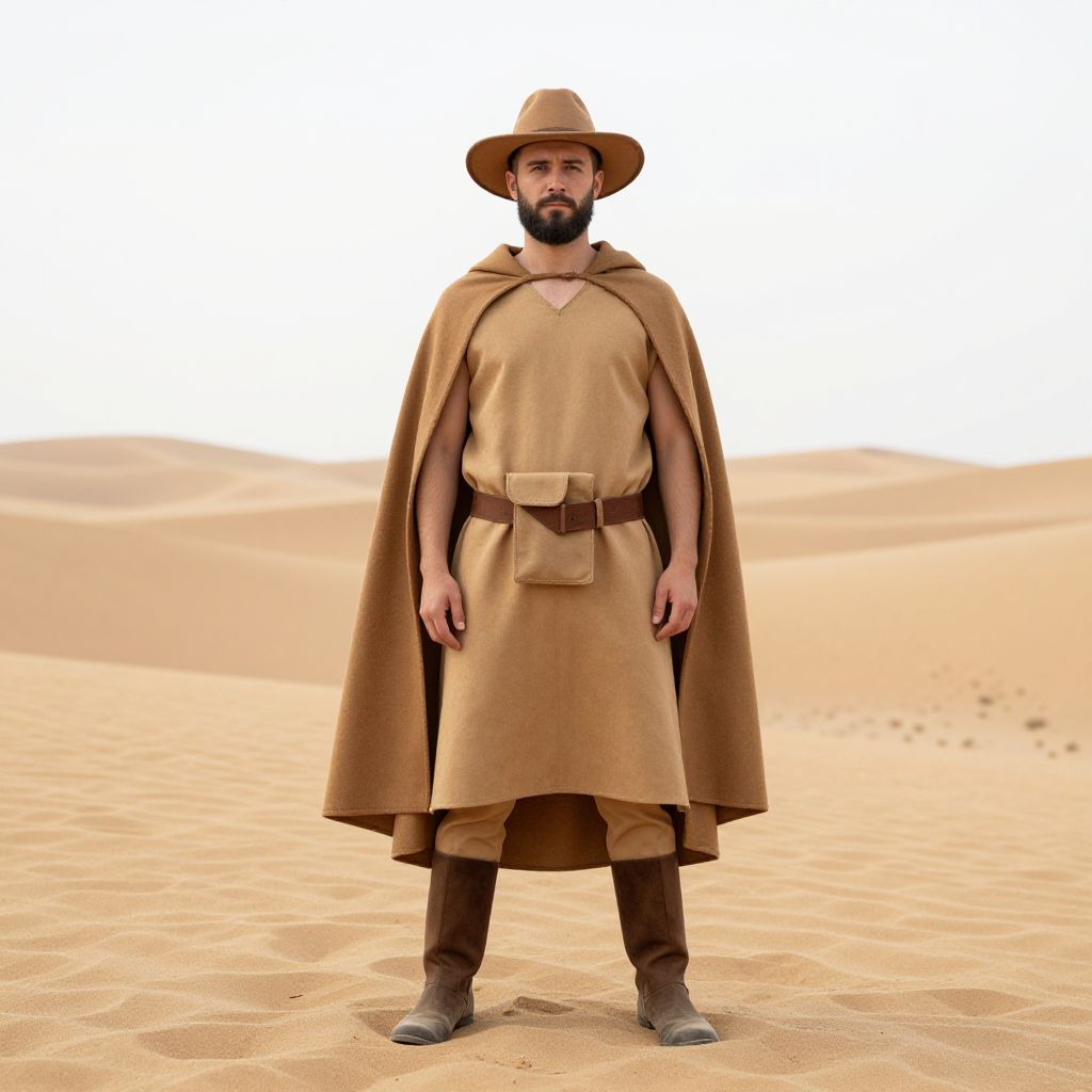 Homemade costume man fancy, 1boy, male focus, solo, beard, facial hair, standing, boots, hat, full body, desert, cape, pouch