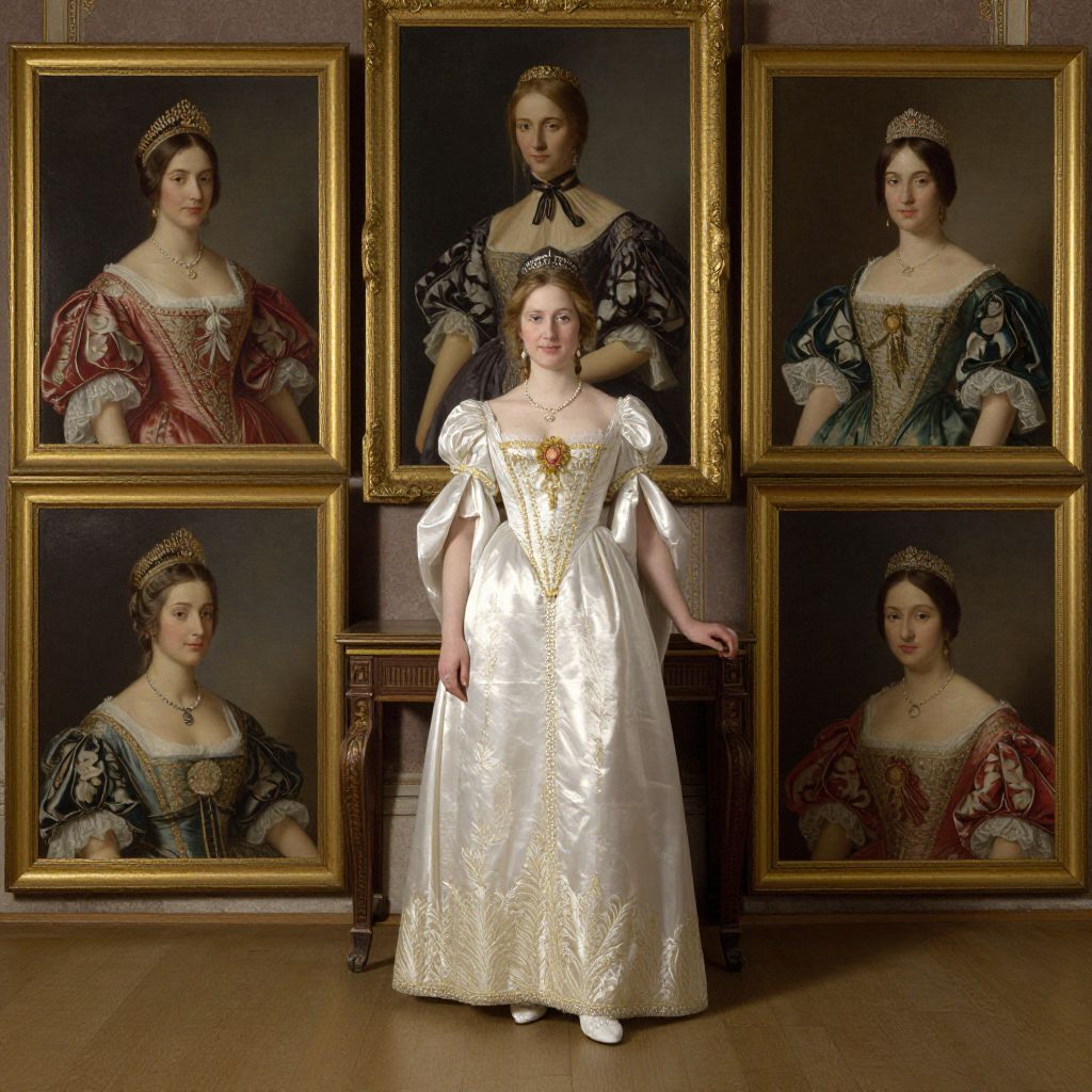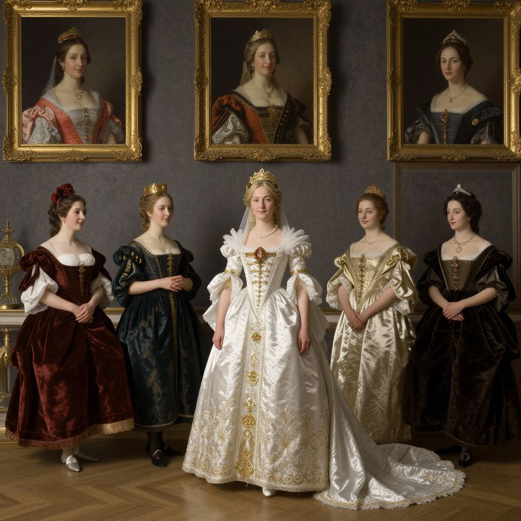 Photograph of five women in 18th-century royal gowns, standing in front of framed portraits, wearing elaborate golden crowns, against a dark