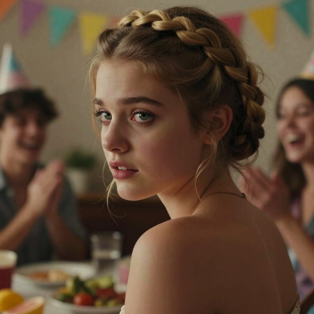 Photograph of a young woman with fair skin and blonde hair styled in intricate braids, wearing a strapless top, looking over her shoulder with a soft, slightly surprised expression. Her blue eyes and pink lips stand out. In the blurred background, two people, one male with dark hair and a party hat, and one female with long brown hair, are smiling and clapping. Colorful triangular bunting decorates the wall. A table with a plate of food and a glass of water is partially visible in the foreground. The lighting is warm, creating a cozy, festive atmosphere.