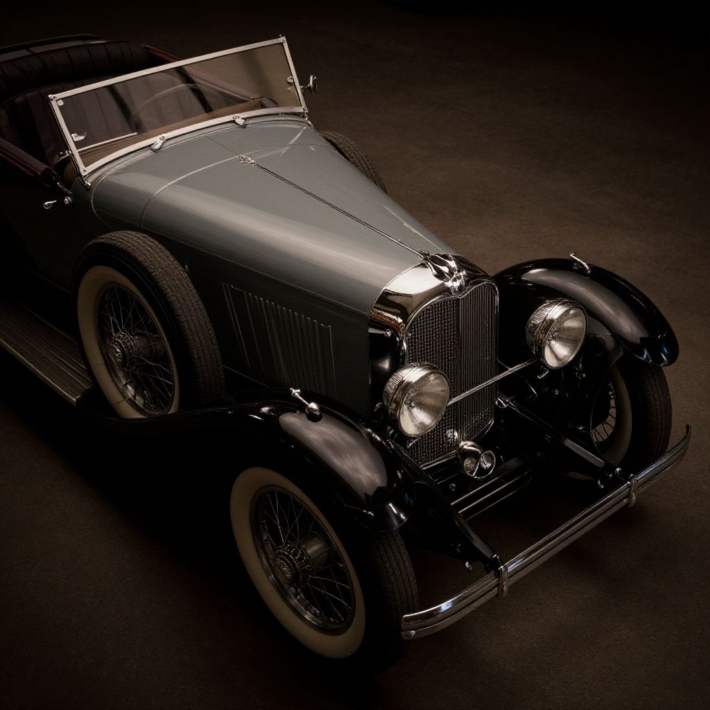 ((raw photo)), cinematic film still ((Top-Down Perspective shot)), photo of Duesenberg Model J - The Duesenberg Model J exhibits a commanding presence due to its elongated hood, rounded fenders, and tall radiator enclosure embellished with vertical louvers. Additional noteworthy features consist of dual sidemount spare tires, a retractable windscreen, and polished wire-spoke wheels., realistic, ((photorealistic)) rim lights, dark shadows, cinematic scene, movie shoot, dark, extremely detailed, glass reflection, hard light hard shadows, vellus, subcutaneous veins, shallow depth of field, vignette, highly detailed, high budget Hollywood film, cinemascope, moody, epic, gorgeous