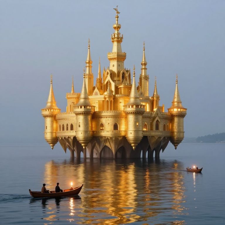 A majestic, golden castle floats serenely above a tranquil sea, its mirrored reflection shimmering like a dream, while figures in candlelit boats navigate the waters below, creating a surreal interplay between light, shadow, and the impossible.