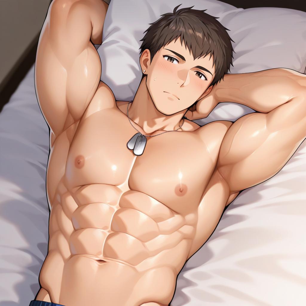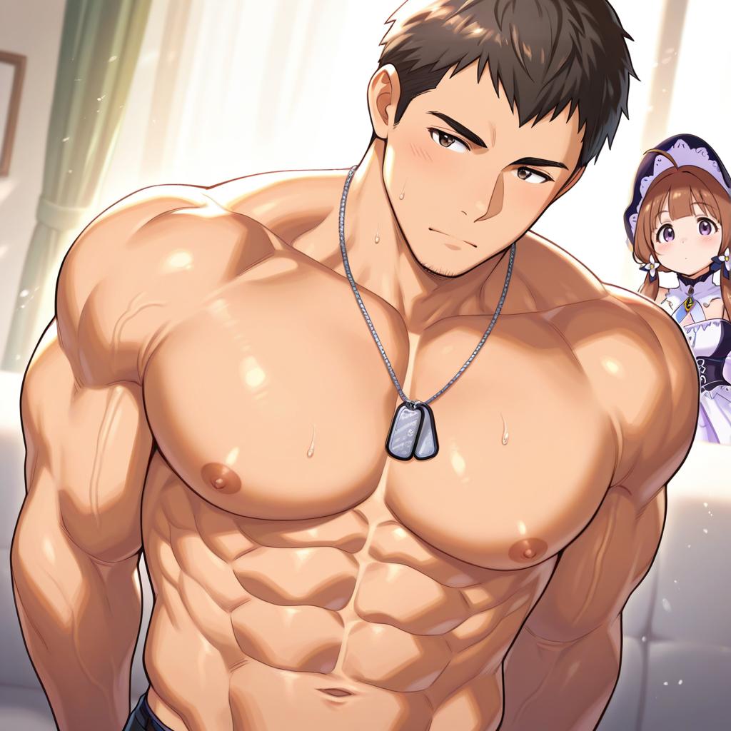 Shingen seiji, idolmaster, 1boy, purple eyes, brown hair, short hair, nipples, necklace, muscular male, bara, abs, large pectorals, dog tags, by artist observerz, illustrious