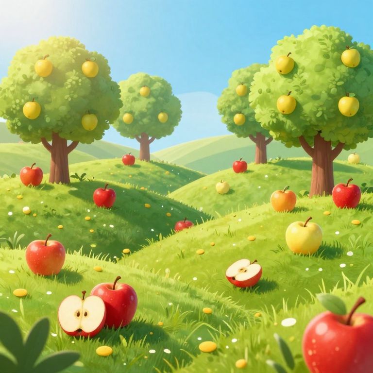 Bright digital illustration of a sunny apple orchard with green hills, red and yellow apples, trees, and a clear blue sky.