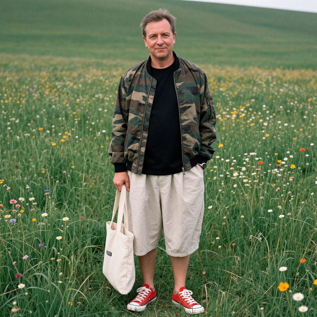 Photograph of a middle-aged man standing in a lush, green meadow filled with wildflowers. He has short, grayish hair and is smiling slightly. He wears a black t-shirt under a camouflage jacket, beige knee-length shorts, and red sneakers with white laces. He holds a white tote bag in his right hand. The background shows a gently sloping hill covered in green grass and scattered flowers, with a cloudy sky overhead. The image has a slight vignette effect, drawing focus to the man. The overall mood is relaxed and natural.