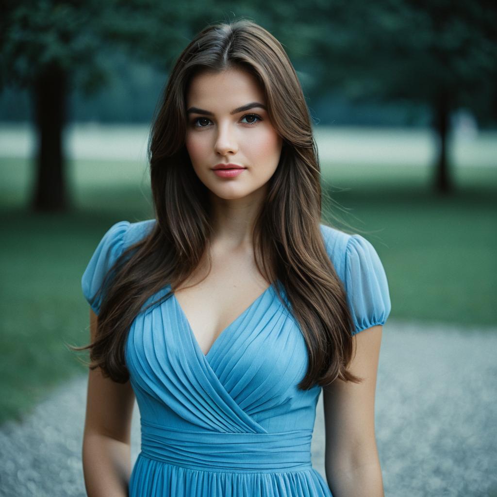 Light blue semi formal dress ,1girl, solo, brown hair, long hair, realistic, dress, blurry background, looking at viewer, blurry, outdoors, lips, short sleeves, blue dress