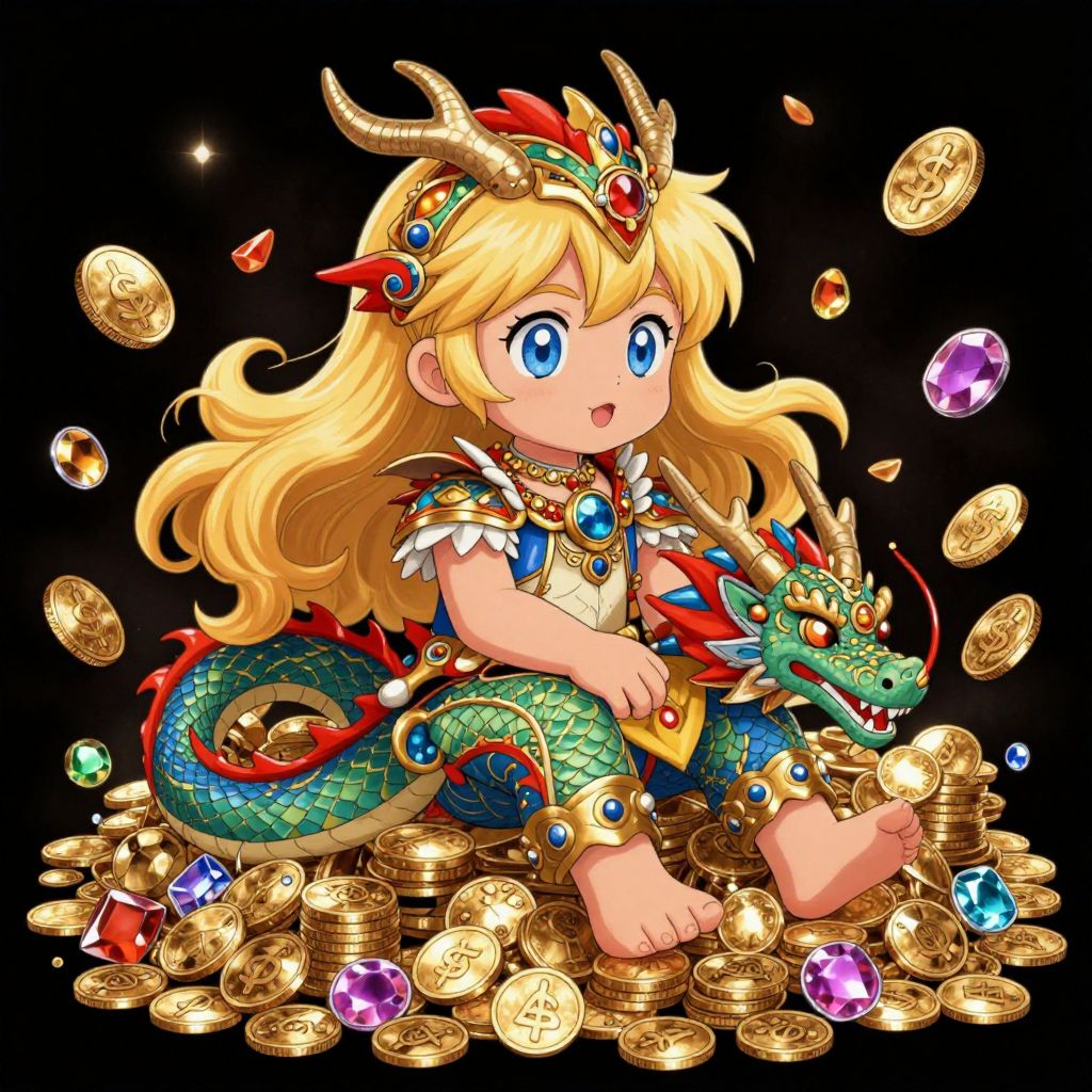 Anime-style drawing of a blonde, blue-eyed child with dragon accessories, sitting among scattered gold coins and colorful gems, against a black background.