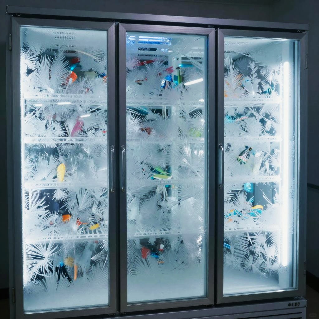 Refrigerada cold storage room with frosted glass doors, thick ice crystals forming patterns on the surfaces, reflecting cold ambiance, vibrant yet subdued colors, cinematic lighting, high-resolution digital art.