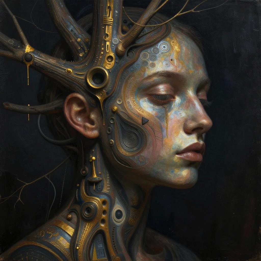 This digital painting features a side profile of a young person with light brown skin and short, dark hair, illuminated by colorful abstract splashes. The background is a muted gray, contrasting with vibrant blues, oranges, and reds. Geometric shapes, including a white triangle and orange circles, overlay the figure, creating a modern, cybernetic aesthetic. The subject's expression is calm, with soft, realistic brushstrokes blending into the abstract elements. The texture of the painting is visible, with visible brushstrokes adding depth and dimension. The overall style combines realism with abstract digital art, evoking a futuristic, tech-inspired feel.