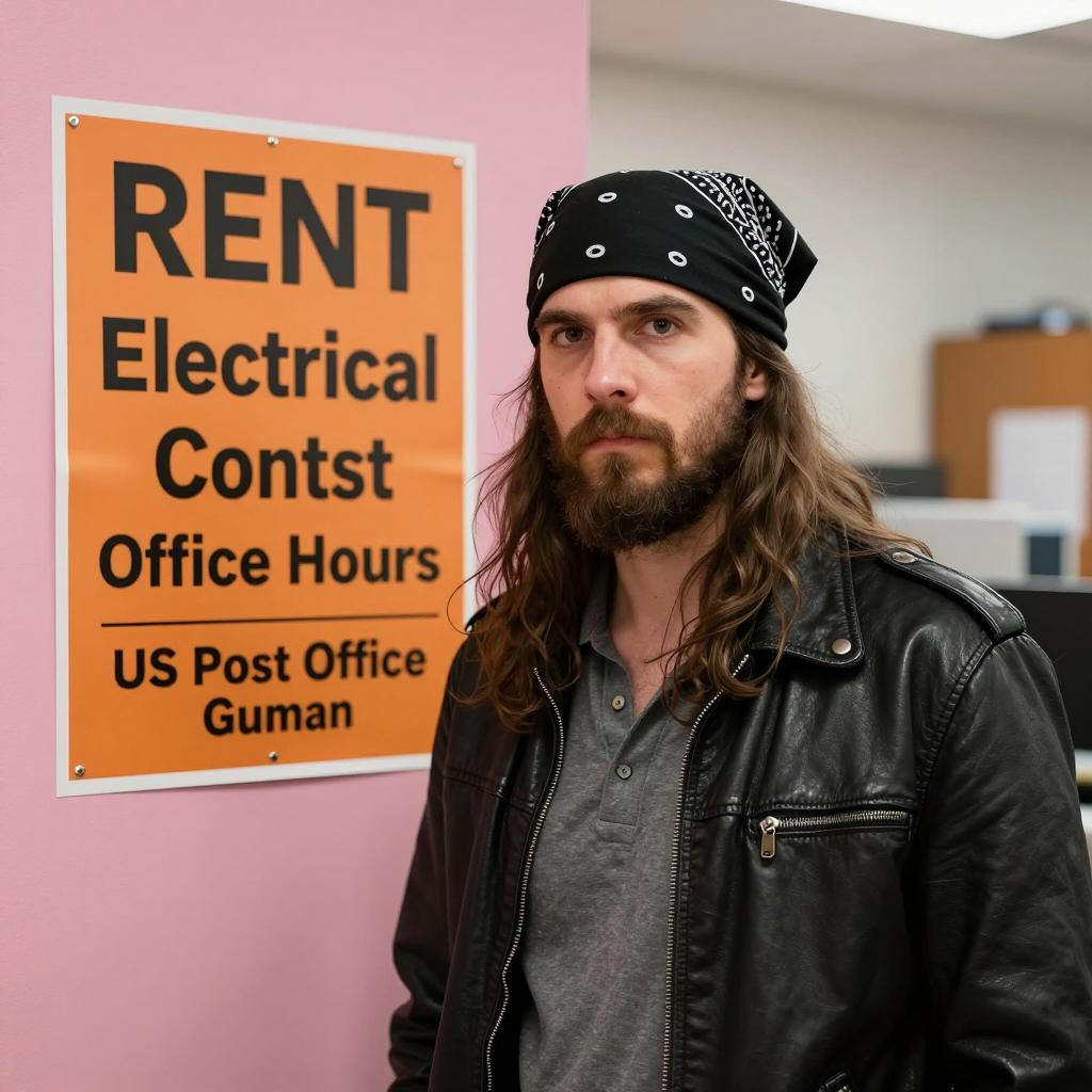 Man with long brown hair, beard, and black bandana stands in front of a pink wall with an orange Rent poster. He wears a black leather jacket over a gray shirt. The poster reads "Electrical Contest Rental Office Hours" and "US Post Office and Guam." He looks to the left with a serious expression. Background includes a white wall and office equipment.