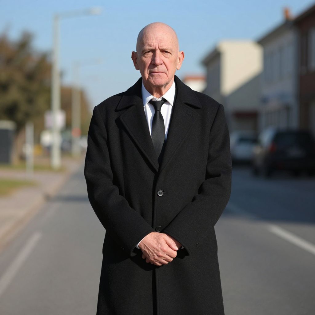 Man black overcoat costume, 1boy, necktie, male focus, black necktie, outdoors, coat, white shirt, blurry background, black coat, collared shirt, shirt, own hands together, day, blurry, bald, old, looking at viewer, street, blue sky, solo, old man, closed mouth, road